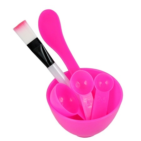 Gezichtsmasker diy set bestaande uit kom, maatlepels, kwast en spatel in het roze of groen.